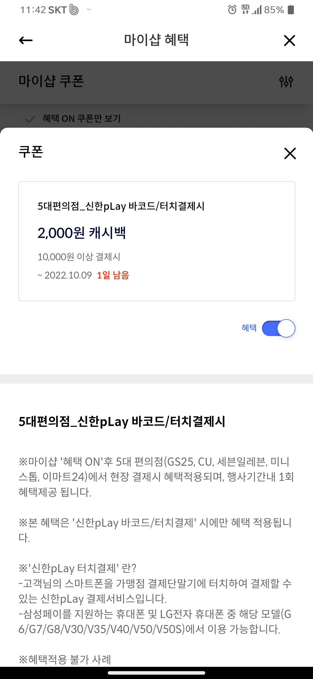 신한플레이앱-검색 메뉴-마이샵 검색 후 쿠폰 ON