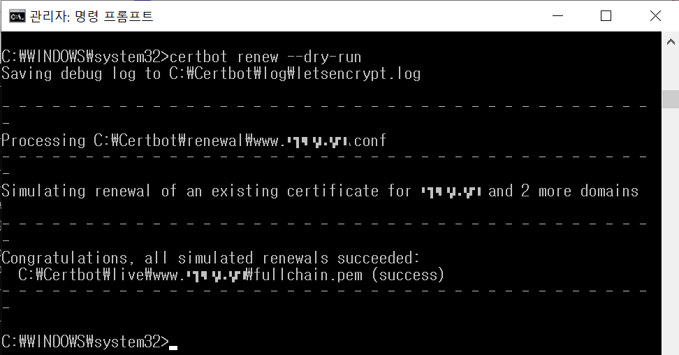 C:\WINDOWS\system32>certbot renew --dry-run <-시뮬레이팅 실행 명령어