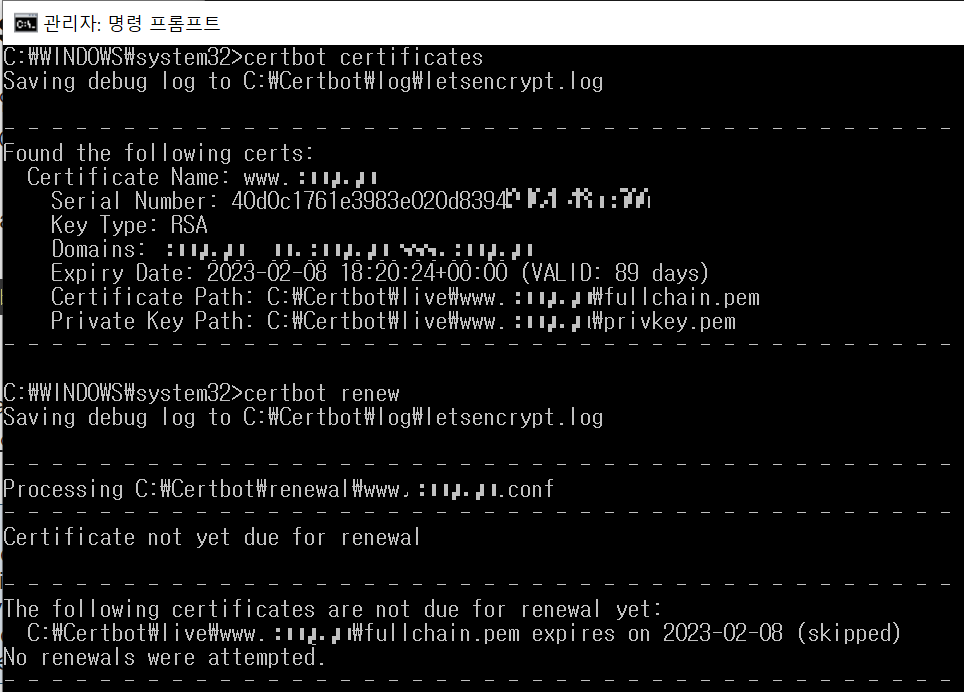 C:\WINDOWS\system32>certbot certificates <-SSL 상태 확인 명령어