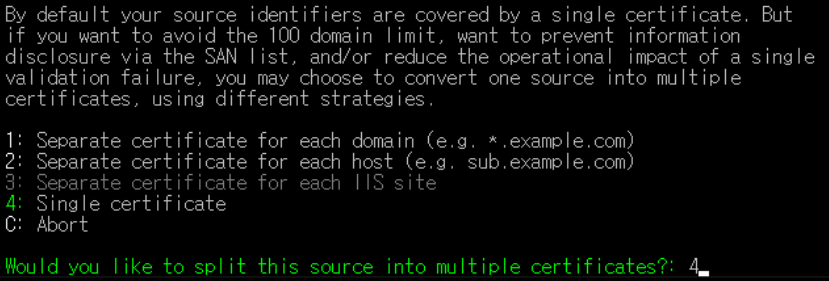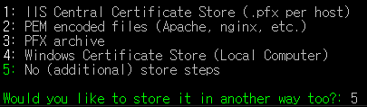 동일한 정보의 인증서를 추가로 다른 확장자로도 발급할건지 선택합니다. 아마 .pem이 아니라 다른 확장자의 인증서가 필요하면 5번 외 다른 번호를 선택하세요. 우린 .pem만 있으면 되기 때문에 5번 선택했습니다.