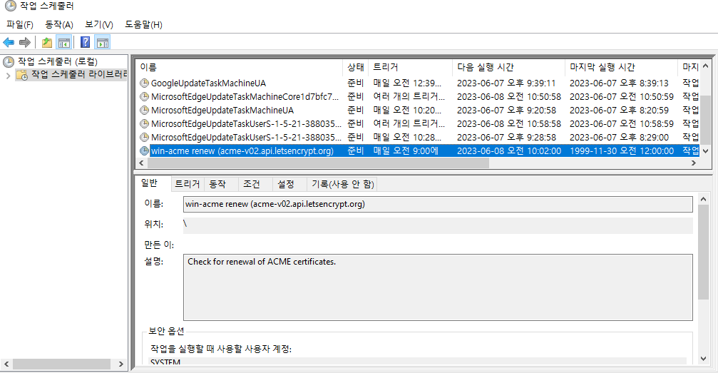 앞으로 매일 아침 9시에 서버PC의 윈도우 작업스케쥴러가 자동으로 인증서 갱신이 필요한지 https://acme-v02.api.letsencrypt.org/ 와 통신하여 검증 한 후 필요가 있다면 갱신을 진행 할 것이다.