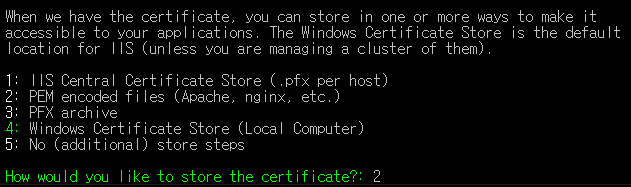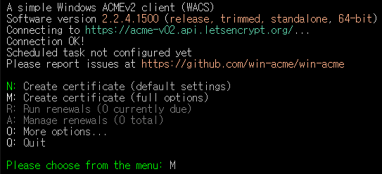 cd C:\Users\PC\Desktop\server-files\win-acme.v2.2.4.1500.x64.trimmed3. 그리고 난 후 CMD 내부에서 wacs.exe 타이핑 하여 실행