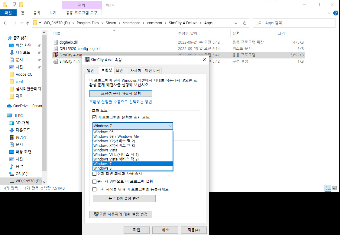 -심시티4 출시년도가 오래 됨에 따라 윈도우7 초과 된 버전의 윈도우에서 실행 오류가 발생